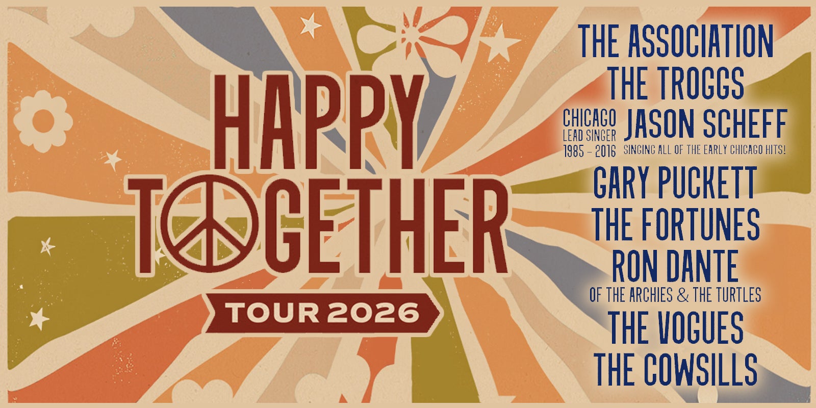 2026 will mark the 17th year of the highly successful, hit-filled summer package, THE “HAPPY TOGETHER” TOUR. The touring sensation that has crisscrossed the nation delighting audiences for over a decade and a half returns this summer with a show full of chart-topping hits from the ‘60s and ‘70s – an undeniable 60+ BILLBOARD Top 40 smashes. The Tour is once again joined by THE ASSOCIATION, THE TROGGS, CHICAGO lead singer 1985-2016 JASON SCHEFF, GARY PUCKETT, THE FORTUNES, RON DANTE from The Archies and The Turtles, THE VOGUES and THE COWSILLS.