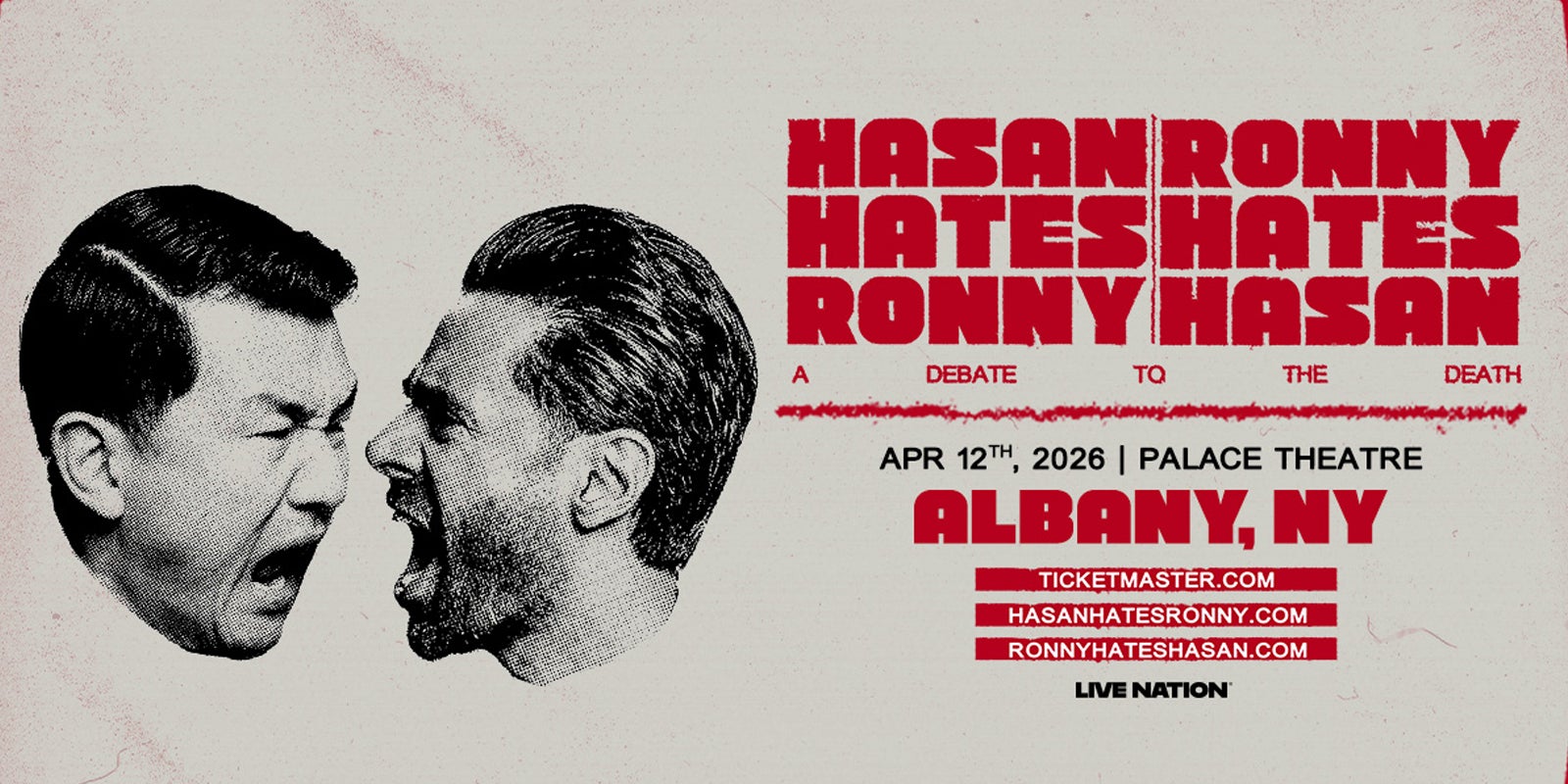 This is not one of those tours where two friends co-headline a show so they can go on vacation together. Ronny and Hasan despise one another. And for one night only, in 19 cities, they will air their grievances -onstage, at the same time – about America, each other, and each other’s entire family trees - for a paying audience.